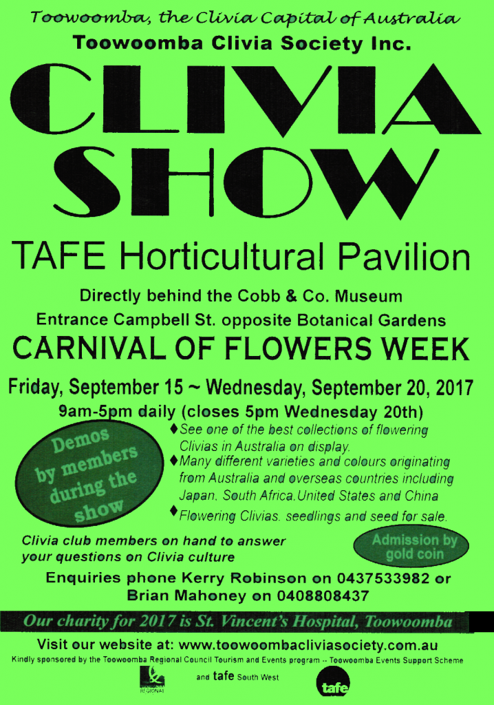See one of the best collections of flowering multi-coloured Clivias on display at the Toowoomba Clivia Show in the TAFE Horticulture Pavilion. Clivias in bloom, seedlings and seeds on sale. Admission is only a gold coin donation towards St Vincent’s Hospital, Toowoomba.