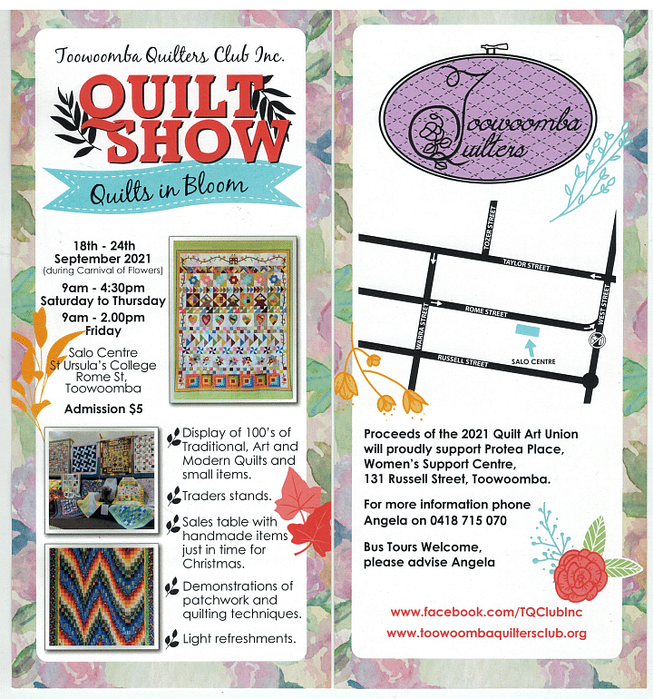 As part of the Carnival of Flowers, Toowoomba Quilters Club Exhibition will be held at the Salo Centre, St Ursula’s College in Rome St, Toowoomba,