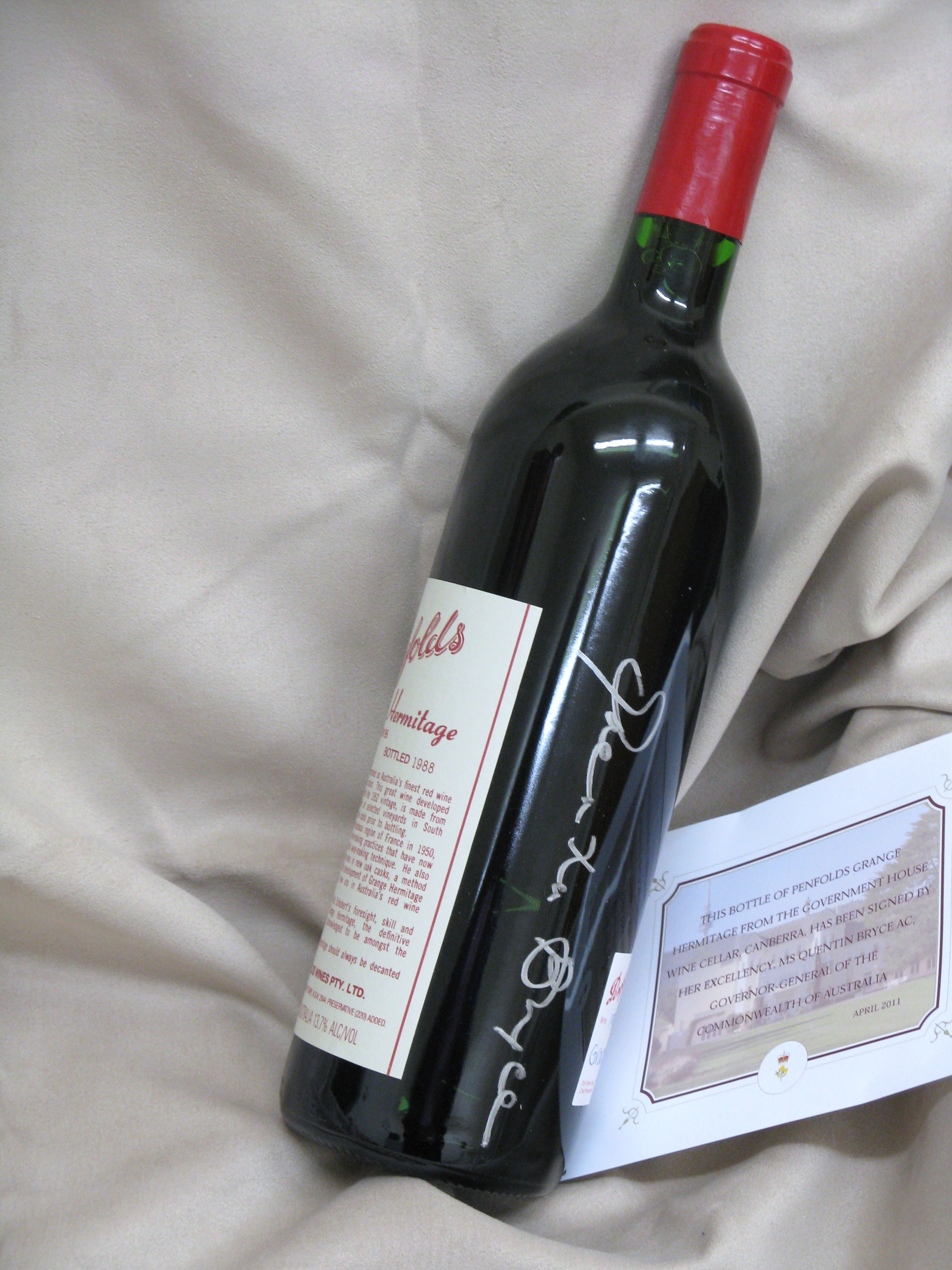 Mark Munro of the Toowoomba Hospice proudly displays a recent gift from the Governor-General. Earlier this year, Mrs. Quentin Bryce donated 100 bottles of rare wine from the Government House cellars to charities. Mark made an immediate application and some weeks later the Hospice received this beautiful bottle of 1986 Grange signed by the Governor-General herself.