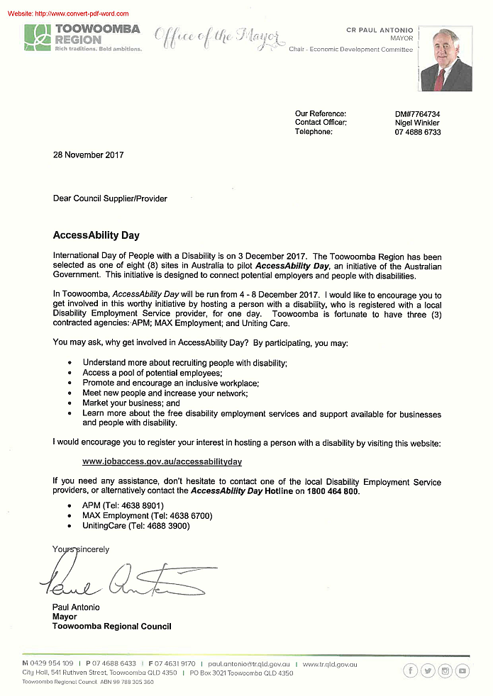 A letter from Mayor, Paul Antonio has been attached to encourage your organisation to participate in the AccessAbility Day initiative of the Australian Government. This initiative supports people with disability in our local community.