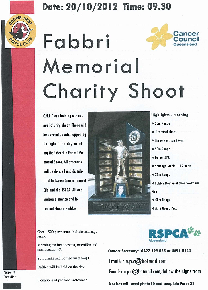 Crows Nest Pistol Club is holding a charity shoot on Saturday 20th Oct. Funds raised will be distributed to the Cancer Council Qld and the RSPCA. The event commences at 9.30am and cost is $20. This includes the sausage sizzle lunch. Drinks and morning tea are extra. We will also be holding raffles throughout the day.