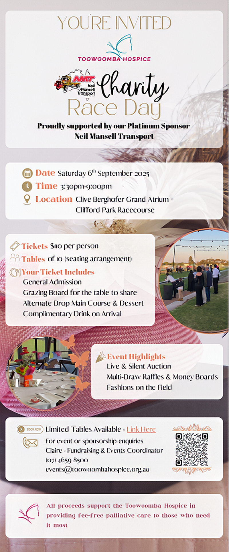Tickets for the Toowoomba Hospice Charity Race Day, proudly supported by Neil Mansell Transport, are now available! Join us at Clifford Park Racecourse on Friday 6th September to kick off the Spring Racing Carnival in style.