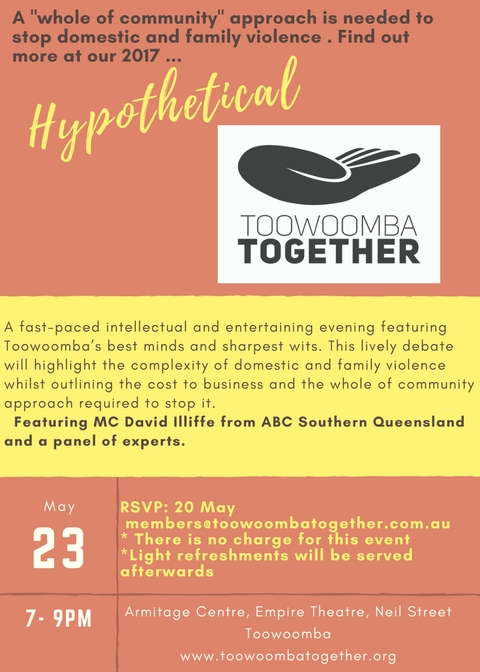 A gentle reminder that the Domestic and Family Violence Prevention Month Hypothetical, hosted by Toowoomba Together with the support of the Empire Theatre, Empire Theatre Foundation, Friends of the Empire and the Toowoomba Regional Council, is on and there are still seats available.