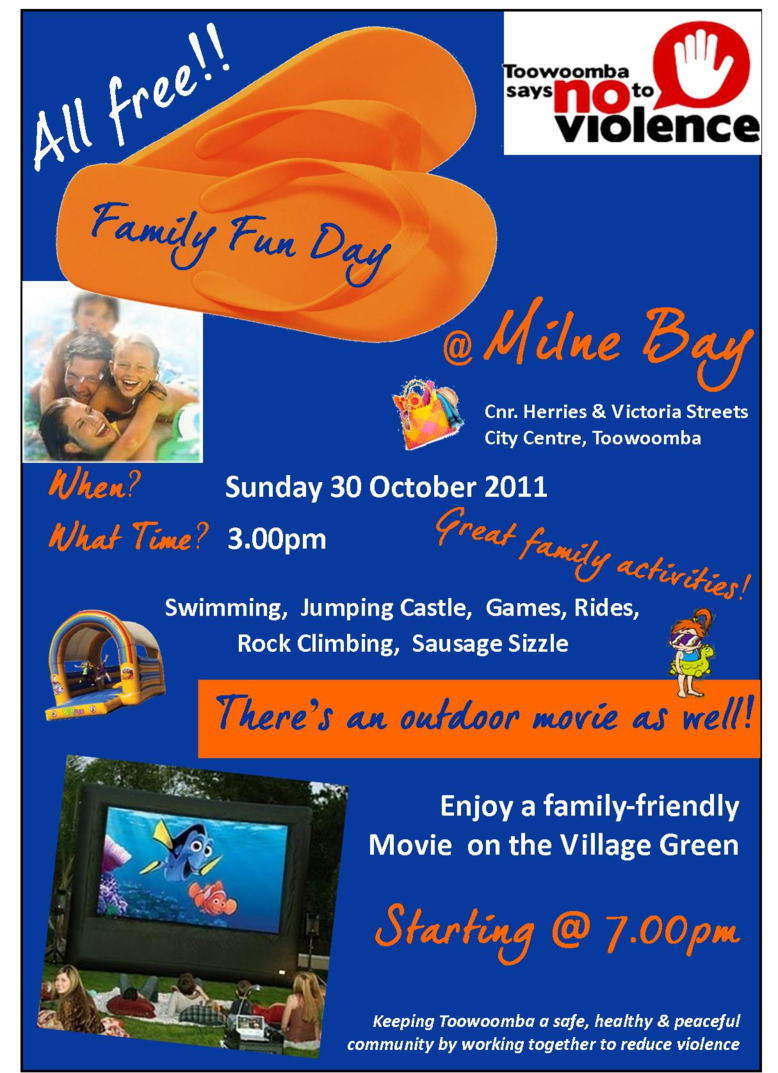 The Toowoomba regional community is invited to a FREE Family Fun Day this Sunday, 30th October at the Milne Bay Aquatic & Fitness Centre, to help raise the awareness of the need to take a stance against all forms of violence and to culminate Family Week 2011 celebrations.