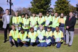 Toowoomba Regional Council mayor Peter Taylor (far left) joined Member for Toowoomba North Kerry Shine (far right) to congratulate graduating members of the Green Army program..