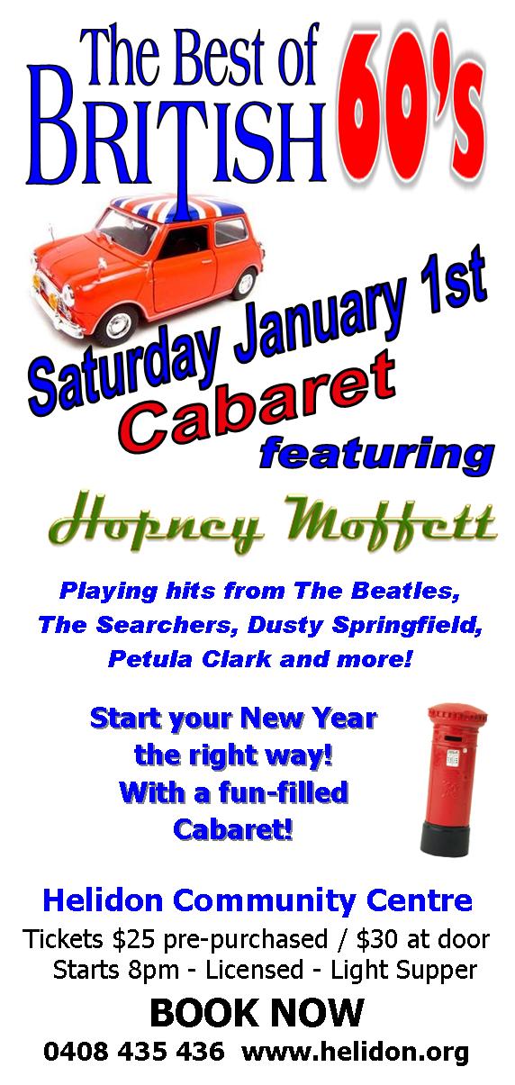There has been a change of venue for the Best of British 60’s†Cabaret at Helidon on Saturday 1st January,2011 . Due to the weather, it will now be held indoors at the Helidon Community Centre, starting at 8 p.m.