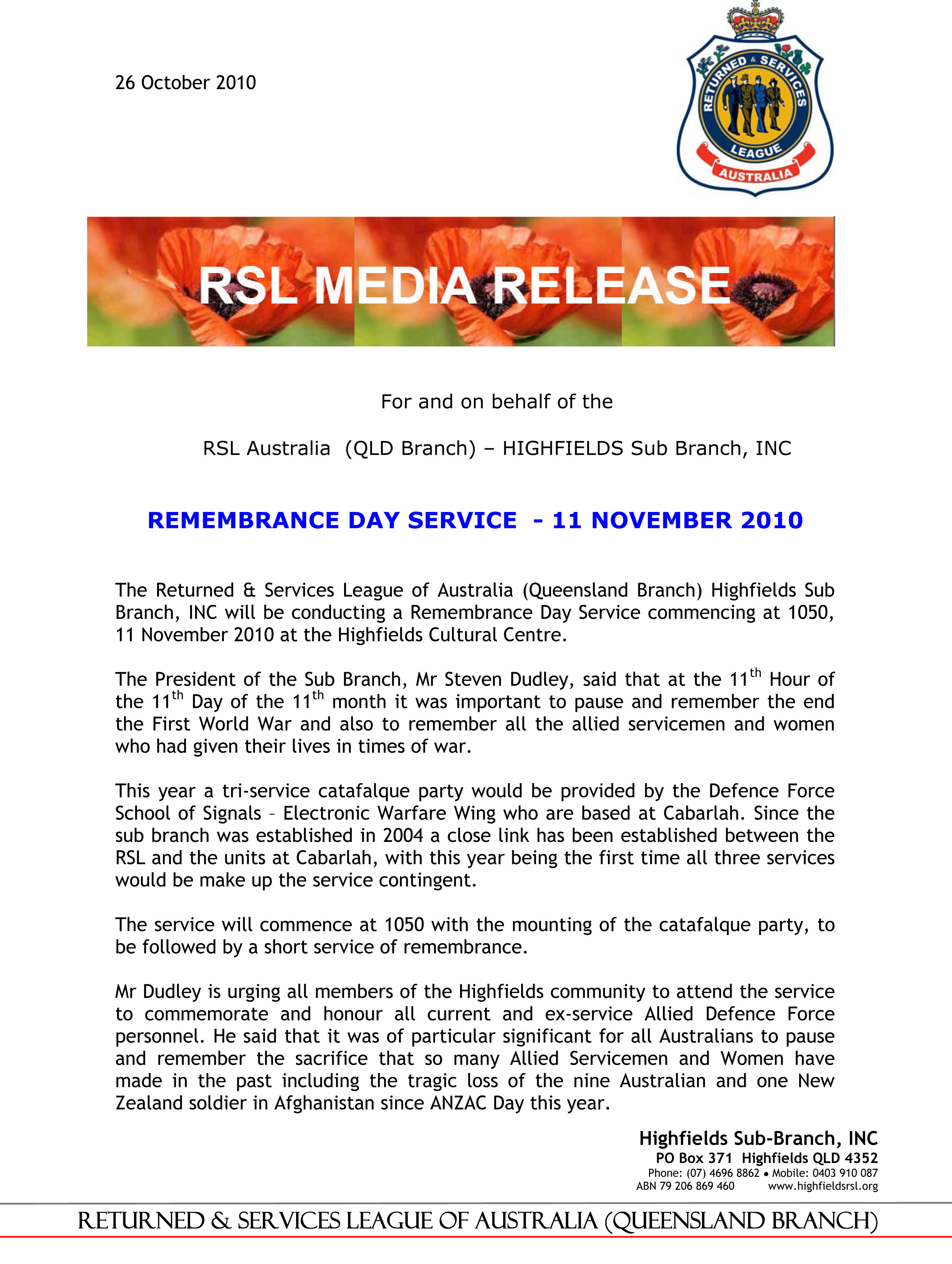Anyone wishing further information can contact the sub branch secretary, Al Taylor, on 4696 9835.