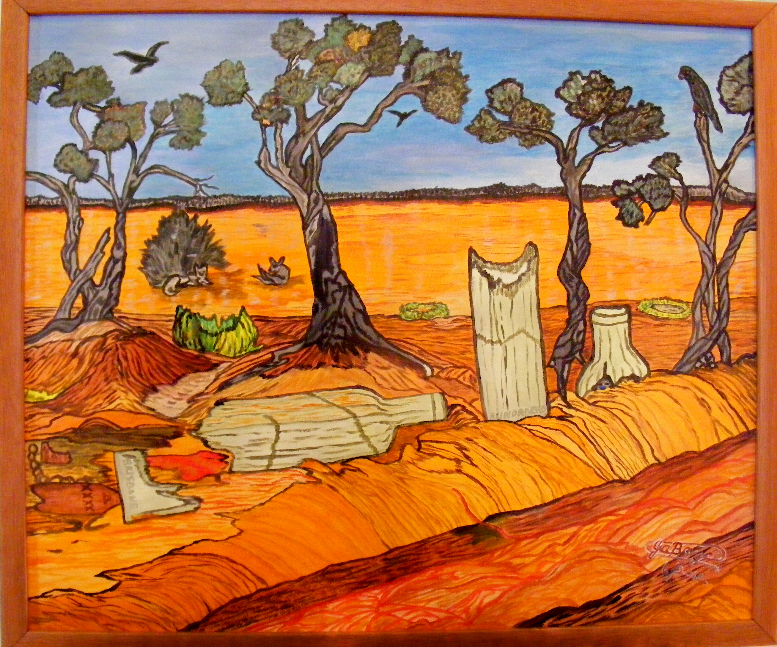 Julie, who was brought up on a 27,500 acre property in the Charleville area, paints in the ‘naive’ style in acrylics and watercolours. She says her works reflect her passion for the Australian bush and country living. Her interest in art began at an early age. Julie remembers her first drawings were in mulga dust, progressing to crayons, with her work ‘Fishing on the Banks of the Warrego’ being exhibited at the local show.