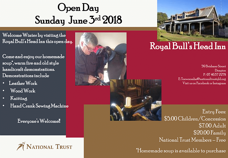 To keep up to date on what’s happening at the Royal Bull’s Head Inn, head to our Facebook Page or follow us on Instagram. Also, if you’re interested in becoming a volunteer, or would like to make a private booking, contact the Trust on <mailto:toowoomba@