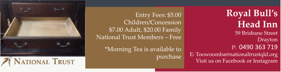 To keep up to date on what’s happening at the Royal Bull’s Head Inn, head to our Facebook Page or follow us on Instagram.  Also, if you’re interested in becoming a volunteer, or would like to make a private booking, contact the Trust on toowoomba@nationaltrustqld.org or phone Debby on 0490 363 719.