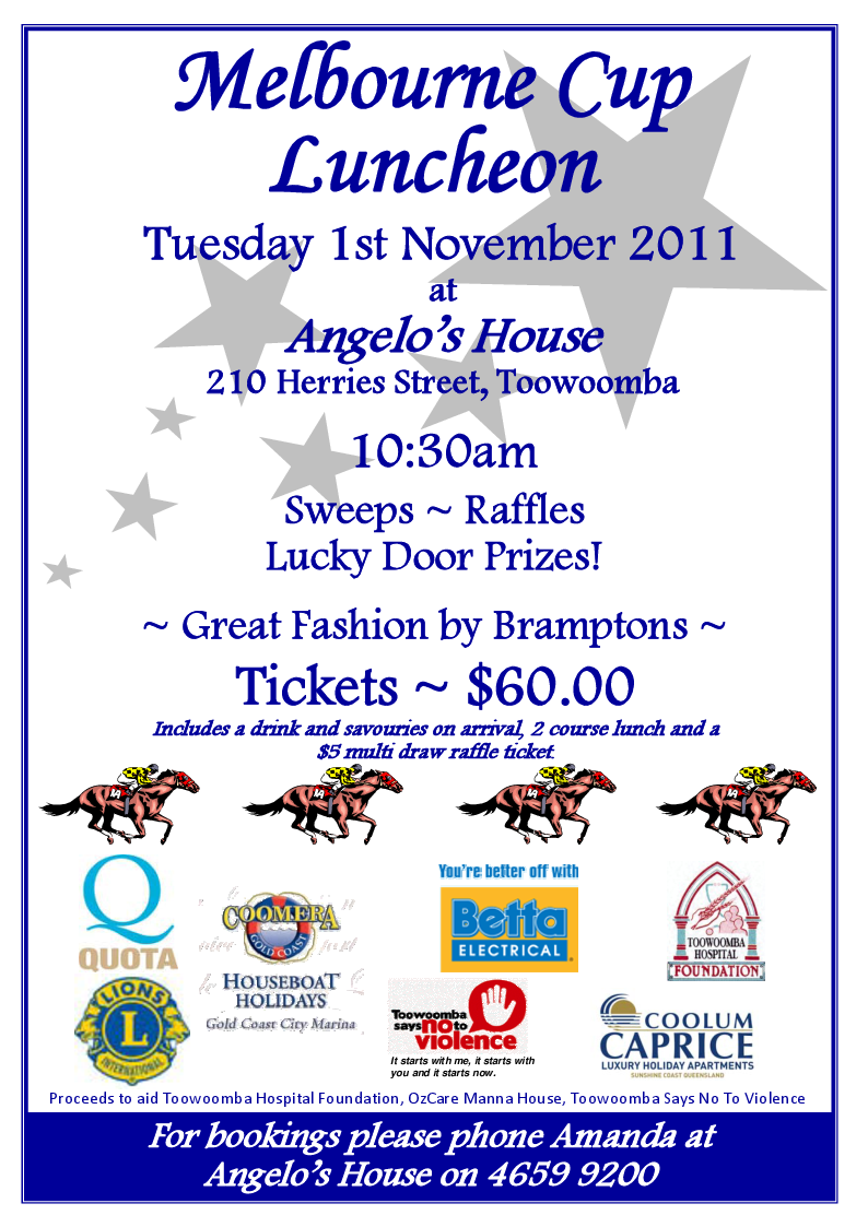 The Toowoomba Hospital Foundation , Ozcare Manna House & Toowoomba Says No to Violence will be the beneficiaries from a Melbourne Cup luncheon hosted by members of the Toowoomba West Lions Club & Quota International Toowoomba on Tuesday 1st November 2011 at Angelo’s House in Herries Street, Toowoomba.
