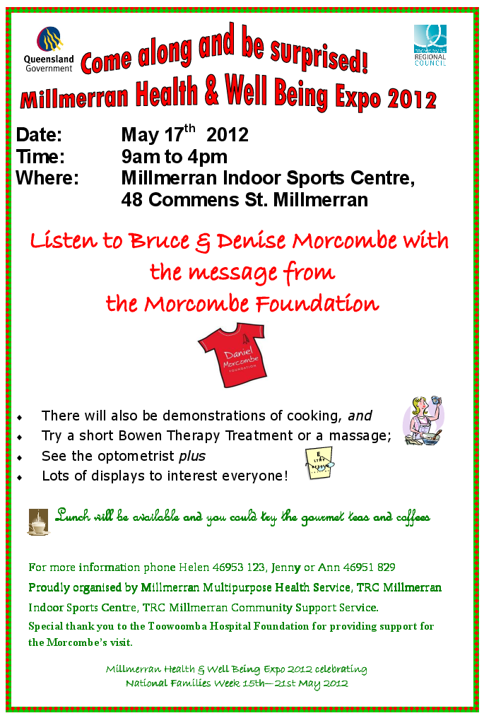 Bruce & Denise Morcombe will speak to adults/parents around 10am, and they will be available all day to speak to those who visit the Health & Welbeing Expo. Bruce and Denise will speak to school students at 2pm.
