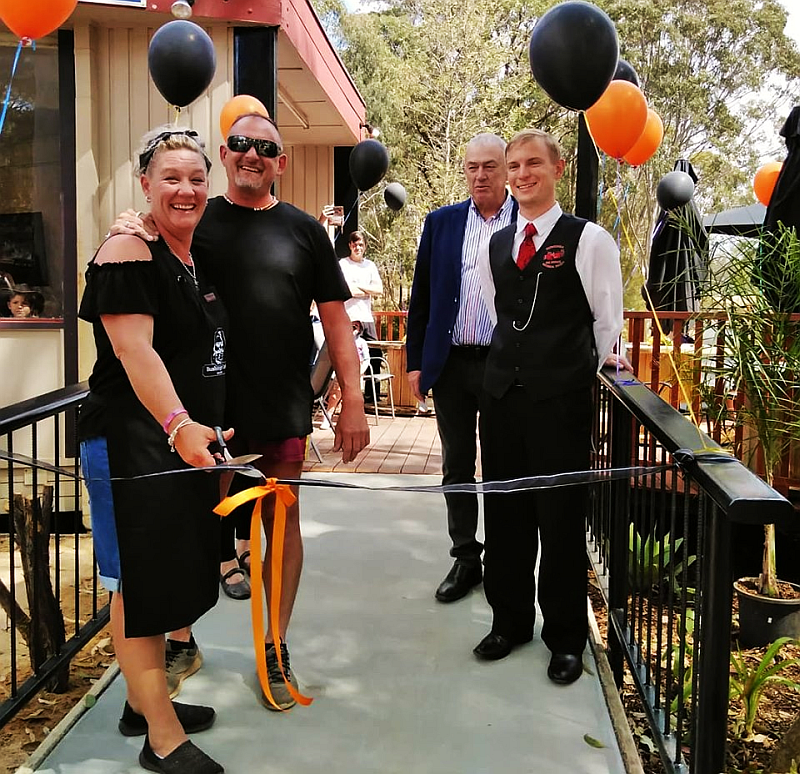 Cutting the Ribbon – Kristie Bazley and Shawn Ashford cafe managers, Peter Homan CEO Southern Queensland Country and James Naumann publicity officer Highfields Pioneer Village.