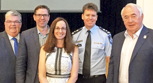 Lifeline Darling Downs and South West CEO Derek Tuffield OAM (left), STRP Chair Cr Geoff McDonald, Toowoomba Hospital Executive Director Shirley-Anne Gardiner, Queensland Police Service Superintendent Mark Kelly and Toowoomba Region Mayor Paul Antonio launch the Safer Toowoomba Regional Partnerships survey