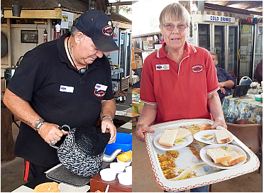 Highfields Pioneer Village volunteers – Dave Robinson pouring billy tea while Nina Beardmore is shown serving freshly made damper during the Highfields Big Cuppa
