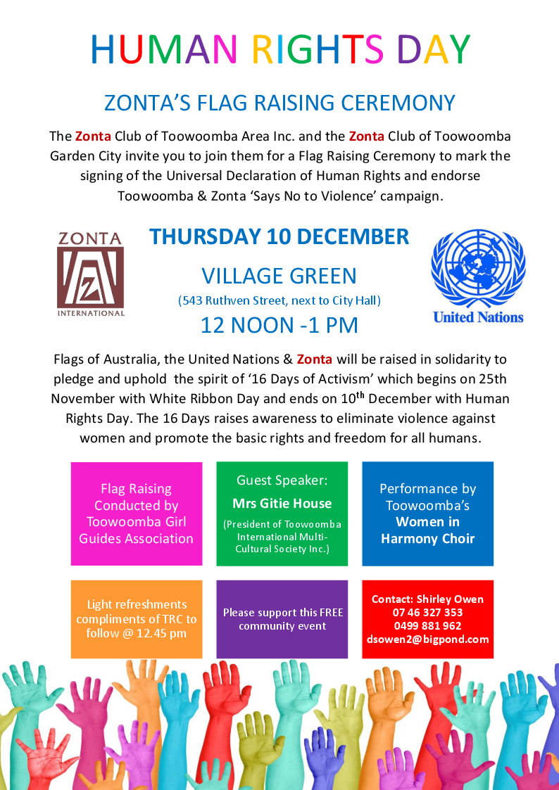 No, Toowoomba isn’t surrendering to anyone.  On Thursday 10th December the Zonta Clubs of Toowoomba are hosting a flag raising to honour the signing of the Universal Declaration of Human Rights and endorse Toowoomba & Zontas ‘Say No to Violence’ campaign.