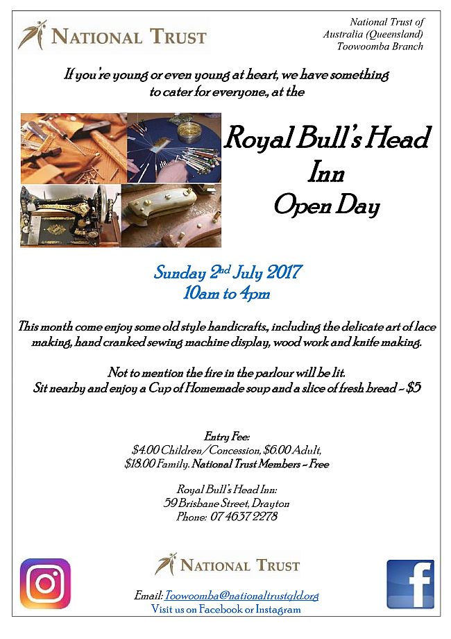 To keep up to date on what’s happening at the Royal Bulls Head Inn, head to our Facebook Page or follow us on Instagram. Also, if you’re interested in becoming a volunteer, or would like to make a private booking, contact the Trust on toowoomba@nationaltrustqld.org or phone Debby on 0402 138 751.