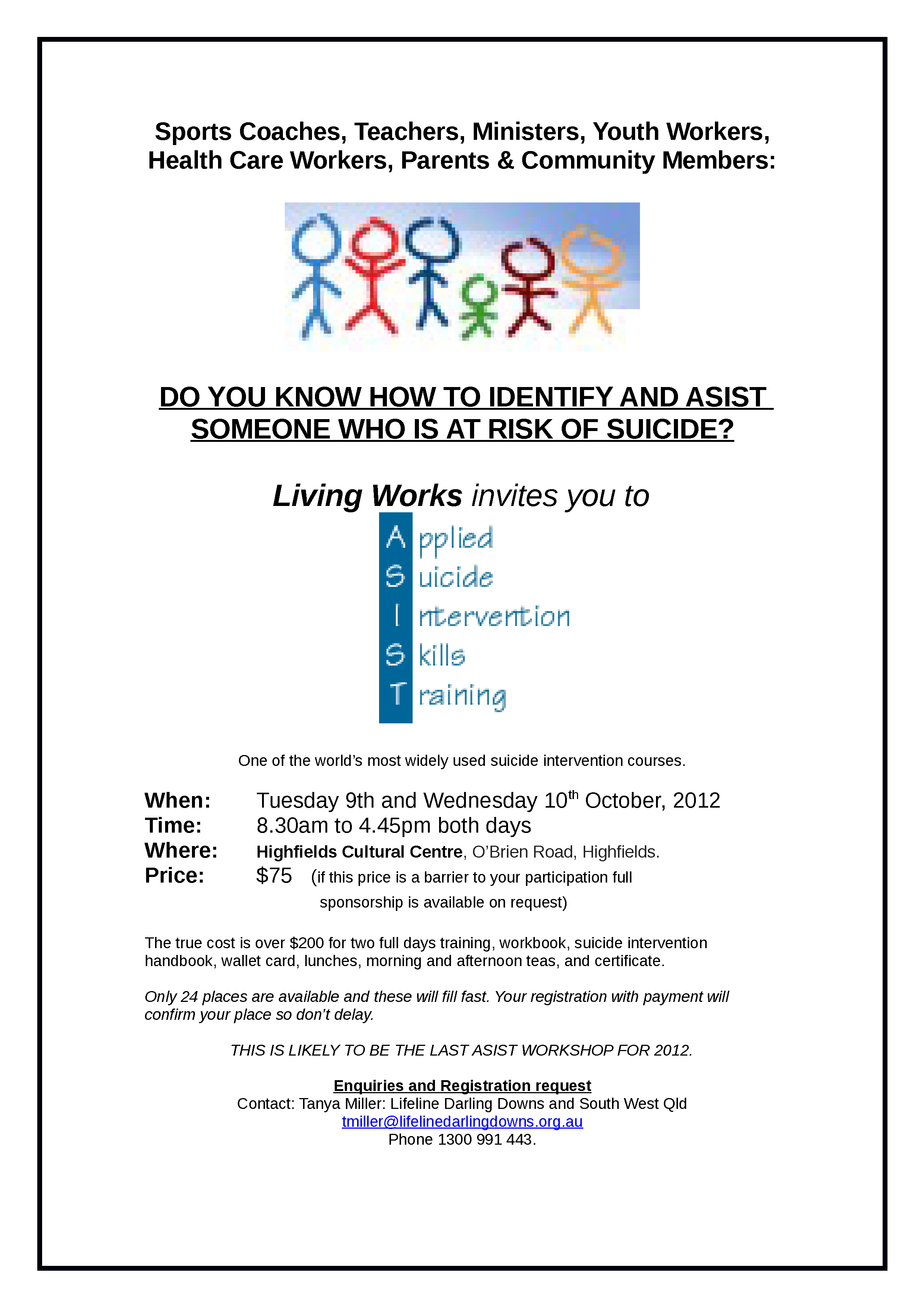 Living Works training programs like ASIST are designed to help promote suicide safer communities. We need as many of the community as possible to be trained in suicide first aid intervention.