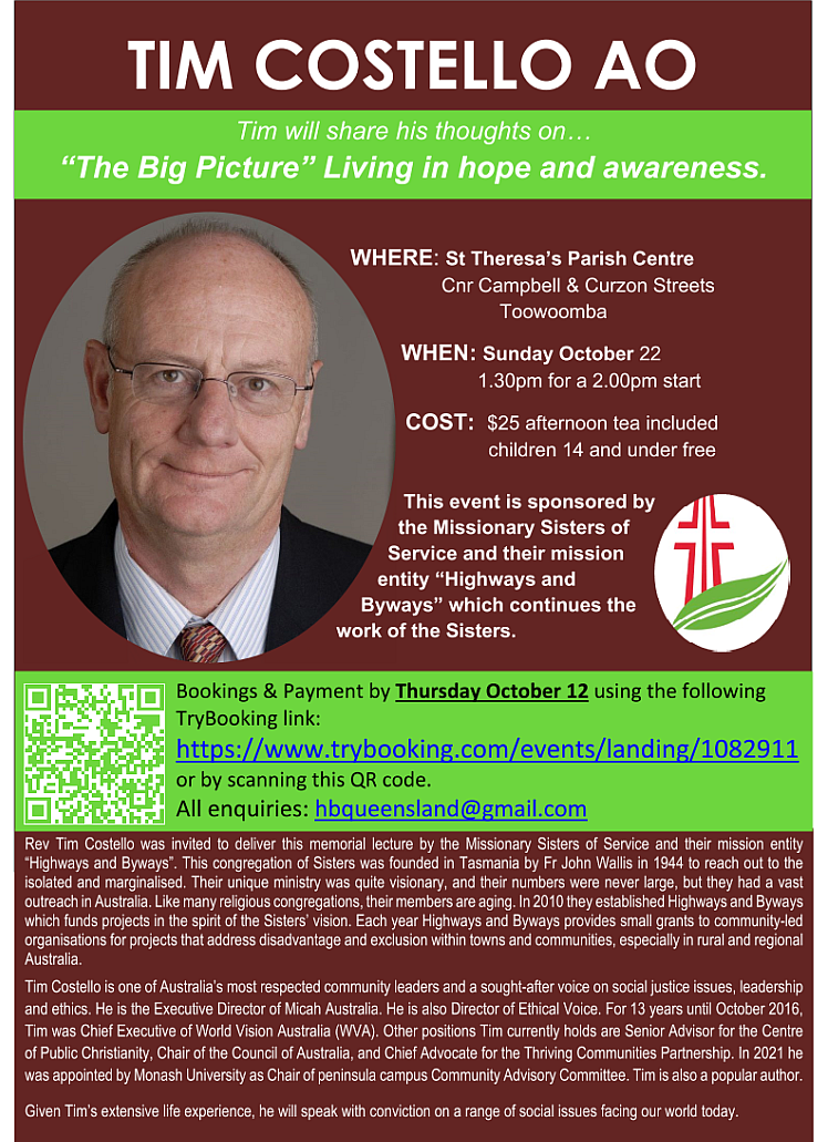 Rev Tim Costello AO is coming to Toowoomba on Sunday 22nd October at 1:30pm. He will be speaking at St Theresa’s Parish Centre, cnr. Campbell and Curzon Sts. on the topic: The Big Picture, Living in Hope and Awarenessâ€.