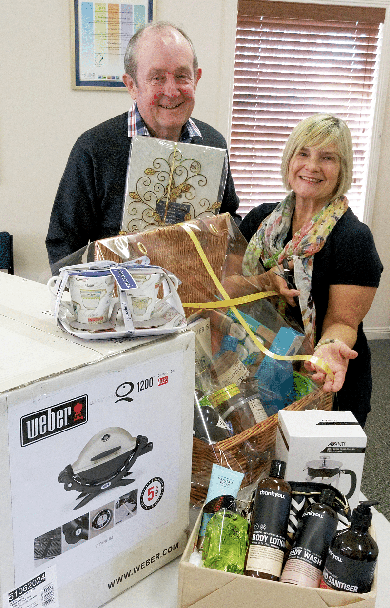 (left: Hospice Chairman Graham Barron and Hospice Volunteer Barb Bissett preparing some of the many prizes to be won at this year’s charity ‘Racing into Spring’ Race Day!)