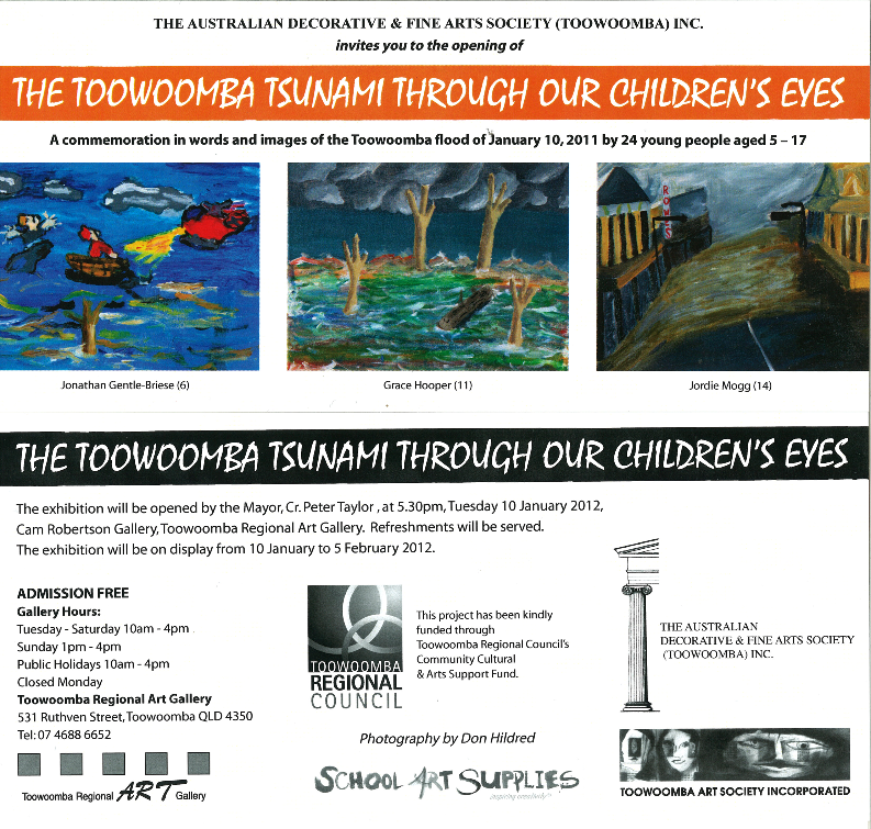 An art exhibition entitled The Toowoomba Tsunami Through Our Children’s Eyes” will be opened on the first anniversary of the devastating floods of Toowoomba and the Lockyer Valley by the TRC Mayor, Cr. Peter Taylor on Tuesday the 10th of January 2012 at 5:30 pm at the Toowoomba Regional Art Gallery.