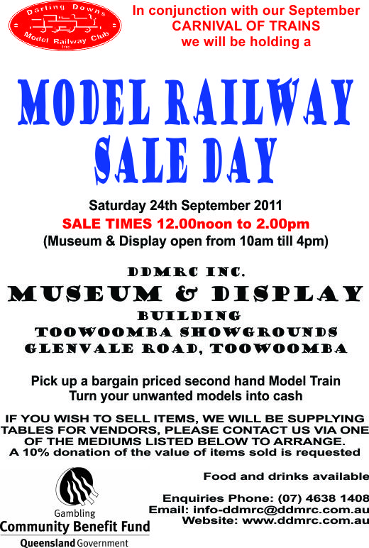 Saturday the 24th September is the Darling Downs Model Railway Club Inc. Sale Day at the Model Railway Museum & Display Centre in Toowoomba Showgrounds.