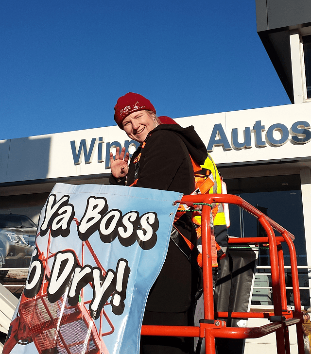 Courtney Gleeson from CLO Lawyers waves good-bye as she is raised up in the Cherry Picker for the 2016 Hang Ya Boss Out To Dry. (the other photo is when the Cherry Picker was raised up!)