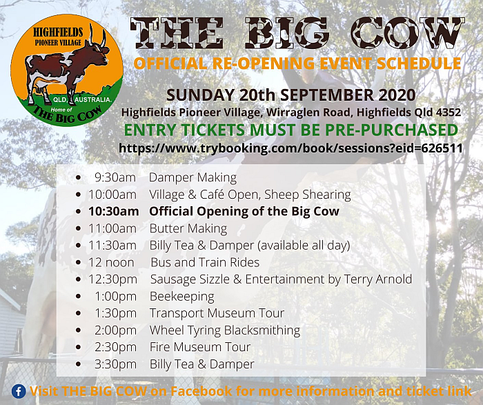 Donated to Highfields Pioneer Village in 2019 and moved to Highfields on the 10th of January 2020, the Big Cow was reassembled on new concrete footings, restored to her former imposing glory by Village volunteers, security fenced and an interpretation centre for visitors set up.