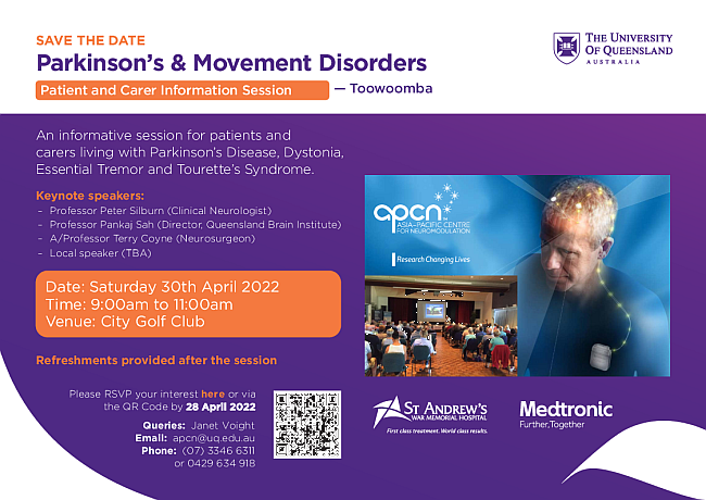 Professor Silburn and QBI Director Professor Pankaj Sah and Associate Professor Terry Coyne will present at a series of information sessions for patients and carers living with Parkinson’s Disease, Dystonia, Essential Tremor and Tourette’s Syndrome in regional Queensland in the coming months.